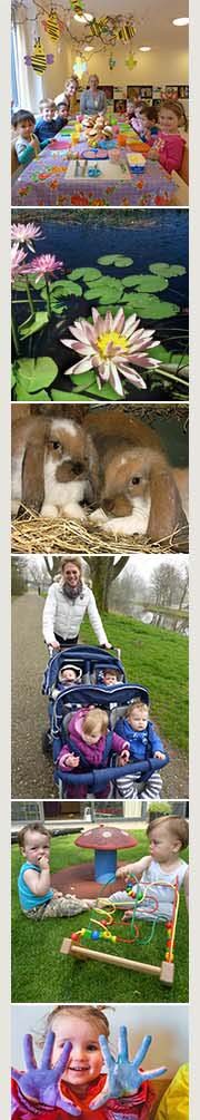 We proberen elke dag met de baby’s naar buiten te gaan. We maken een wandeling met de bolderkar en kinderwagen, of we spelen op het zachte gras in de tuin. De zintuigen van de baby’s worden gestimuleerd door de wind, het geluid van vogels in onze vogelhuisjes, de eendjes en geiten in de buurt, de warme zon en de geur van de natuur en bloemen, maar ook door kou en regen.